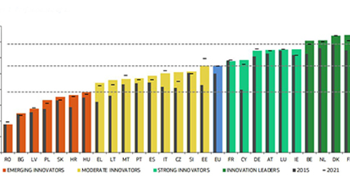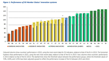 Het Europees Innovatie Scorebord (EIS) rangschikt de 27 EU-lidstaten en een aantal niet-EU landen volgens hun onderzoeks- en innovatieve sterkte in vier ‘prestatiegroepen’ op basis van hun prestatie t.o.v. het Europees gemiddelde: