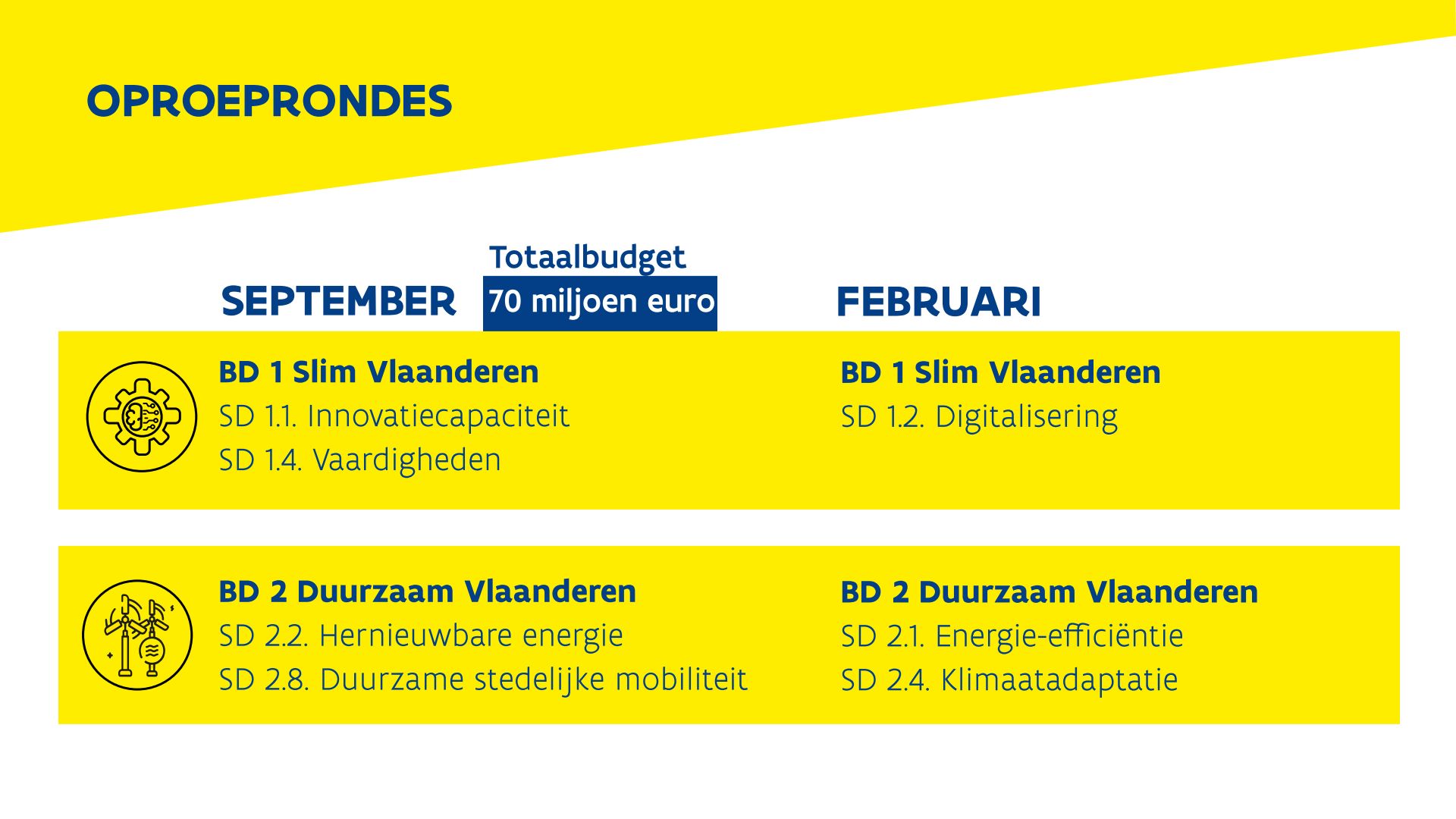 De eerste 2 weken van oktober organiseren we 5 provinciale infosessies waar de oproepen in detail toegelicht zullen worden.