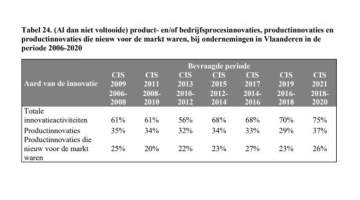 - Meer concreet rapporteert 69% van de ondernemingen procesinnovaties en 37% productinnovaties.