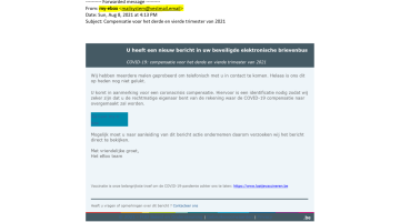 Momenteel gaan weer enkele nieuwe phishing e-mails rond die grafisch goed lijken op e-mails van de overheid, en die vaak zelfs doorlinken naar de echte website van de FOD Financiën of laatjevaccineren.be. Helaas hebben deze e-mails voorts helemaal niets met de Vlaamse of Belgische overheid te maken hebben! Dit kan je onmiddellijk afleiden uit het vreemde e-mailadres van de afzender: