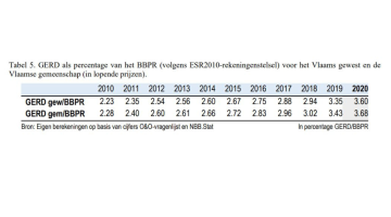 Wanneer we de totale O&O-uitgaven (GERD) uitdrukken als percentage van het bbpr bekomen we voor 2020 een percentage van 3,60% op gewestniveau en 3,68% op gemeenschapsniveau. De tabel hieronder geeft een overzicht van deze cijfers samen met de historische gegevens. Over de afgelopen tien jaar zien we een significante stijging van de totale O&O-uitgaven als percentage van het bbpr. Het percentage stijgt van 2,23% in 2010 tot 3,60% in 2020 volgens de gewestbenadering, of van 2,28% tot 3,68% volgens de gemeenschapsbenadering.